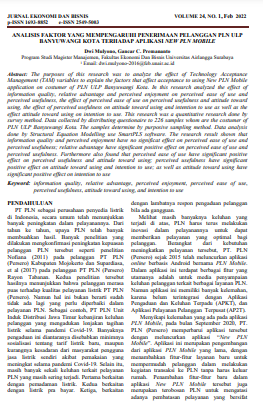 The purposes of this research was to analyze the effect of Technology Acceptance Management (TAM) variables to explain the factors that affect acceptance to using New PLN Mobile application on costumer of PLN ULP Banyuwangi Kota. In this research analyzed the effect of information quality, relative advantage and perceived enjoyment on perceived ease of use and perceived usefulness, the effect of perceived ease of use on perceived usefulness and attitude toward using, the effect of perceived usefulness on attitude toward using and intention to use as well as the effect attitude toward using on intention to use. This research was a quantitative research done by survey method. Data collected by distributing questionaire to 226 samples whom are the costumer of PLN ULP Banyuwangi Kota. The samples determine by purposive sampling method. Data analysis done by Structural Equation Modelling use SmartPLS software. The research result shown that information quality and perceived enjoyment have no significat effect on perceived ease of use and perceived usefulness; relative advantage have significant positive effect on perceived ease of use and perceived usefulness. Furthermore also found that perceived ease of use have significant positive effect on perceived usefulness and attitude toward using; perceived usefulness have significant positive effect on attitude toward using and intention to use; as well as attitude toward using have significant positive effect on intention to use