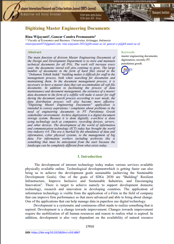 The main function of division Master Engineering Documents of the Design and Development Department is to store and maintain technical documents for all PGs. The work will increase every year, the documents stored will also continue to grow. The large number of documents in the form of hard files stored in the “Dokumen Teknik Induk” building makes it difficult for staff in the management process, both when searching for documents and maintaining them. In the document management process, it is necessary to have a master data that can accommodate all soft file documents. In addition to facilitating the process of data maintenance and document management, the existence of a master data document in the form of a softfile will make it easier for staff during the document search process according to user needs, the data distribution process will also become more effective. “Digitizing Master Engineering Documents” application is intended to convey aspirations / complaints about problems in the need of engineering documents in PT Petrokimia Gresik stakeholder environment. Archive digitization is a digital document storage system. Because it is done digitally, e-archive is done using technology such as computers, recording devices, servers, and other devices. The development of the world of information and communication technology (ICT) today has brought the world into industry 4.0. This era is marked by the abundance of data and information, cyber physical systems, to the management of big data. For information workers including archivists this is something that must be anticipated from the start because the landscape can be completely different from what exists today.