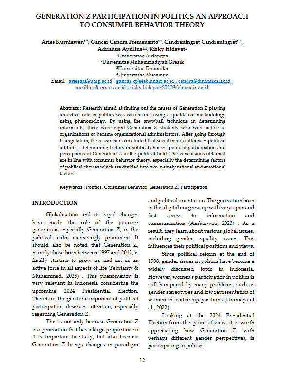 Research aimed at finding out the causes of Generation Z playing an active role in politics was carried out using a qualitative methodology using phenomology. By using the snowball technique in determining informants, there were eight Generation Z studentswho were active in organizations or became organizational administrators. After going through triangulation, the researchers concluded that social media influences political attitudes, determining factors in political choices, political participation and perceptions of Generation Z in the political field. The conclusions obtained are in line with consumer behavior theory, especially the determining factors of political choices which are divided into two, namely rational and emotional factors.