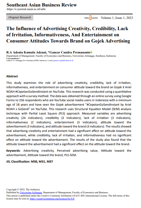 The Influence of Advertising Creativity, Credibility, Lack of Irritation, Informativeness, And Entertainment on Consumer Attitudes Towards Brand on Gojek Advertising